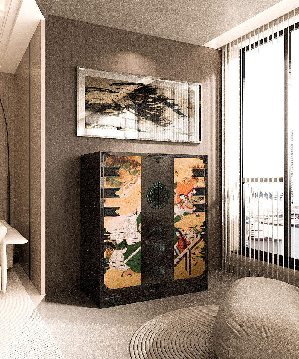 Designed by Michio Fujinami, the cabinet unites the delicacy of yamato-e painting with the precision of contemporary design. Each surface is finished in hand-applied urushi lacquer and gold leaf, echoing the Heian period’s aesthetic ideal of quiet opulence.