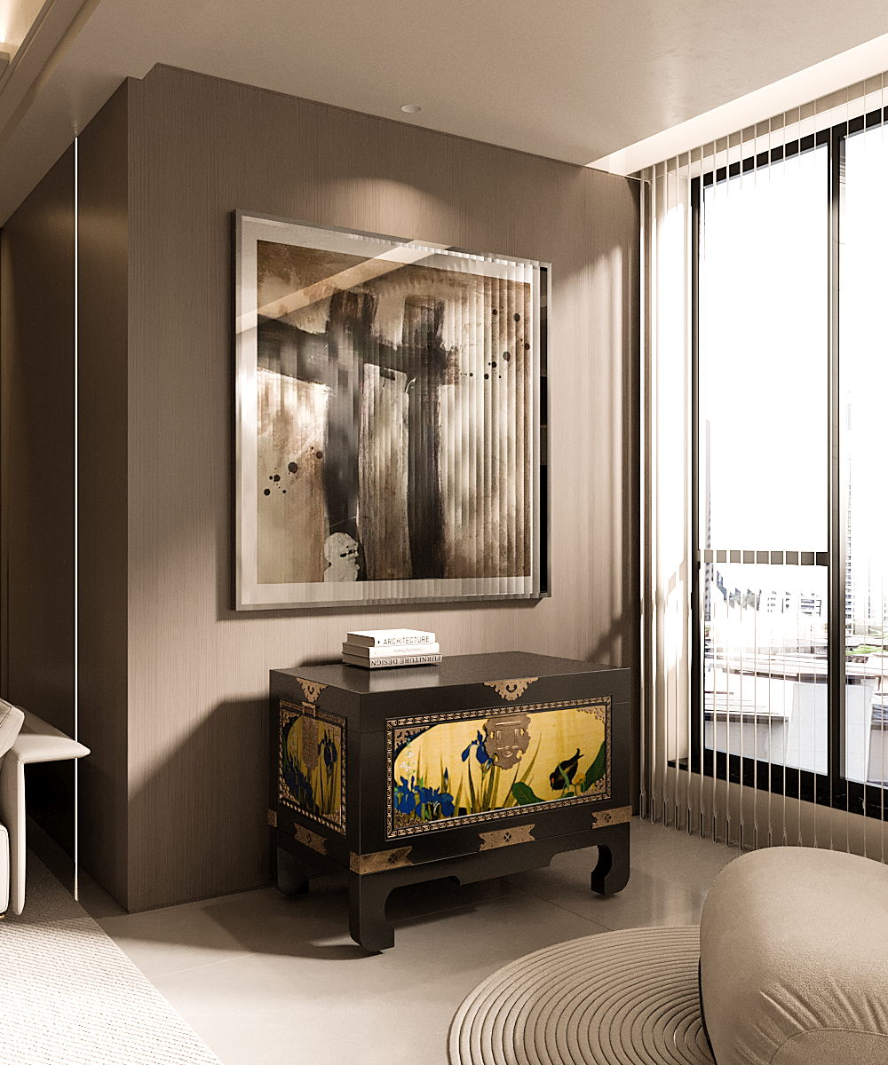 Authentic kanagu hardware in blackened metal adds contrast and structural elegance, anchoring the piece in centuries of Japanese tradition. Compact yet striking, this trunk brings Rinpa heritage into the heart of contemporary interiors.