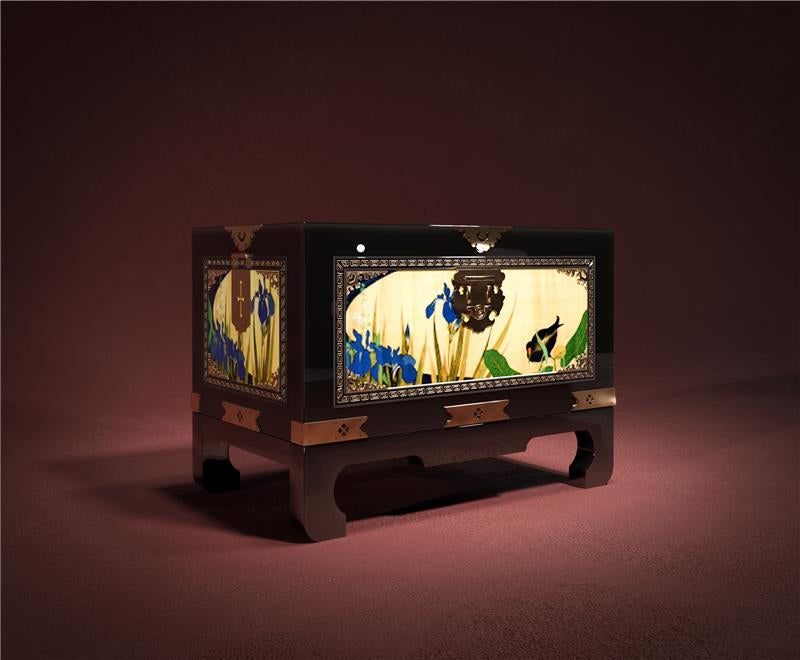 The Kuro (黒) Iris Trunk reimagines the celebrated iris motifs of Ogata Kōrin’s “Kakitsubatazu” screens within a functional lacquer trunk. Finished in deep shikkoku urushi lacquer, its panels feature gold-framed iris blossoms rendered in vibrant hues beneath luminous lacquer.